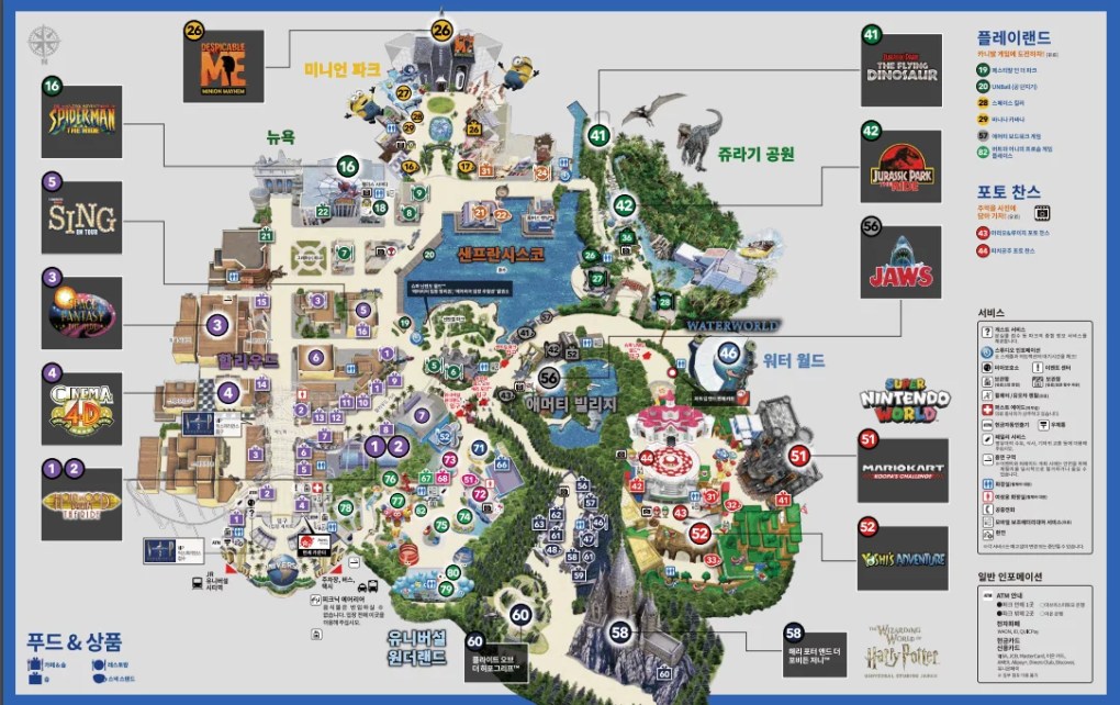 아래는 오사카 유니버셜스튜디오재팬의 지도입니다. 해당지도를 통해 유니버셜스튜디오를 미리 공부하고 가시면 더 최적화된 동선을 짜고 시간을 아낄 수 있을 것입니다.
