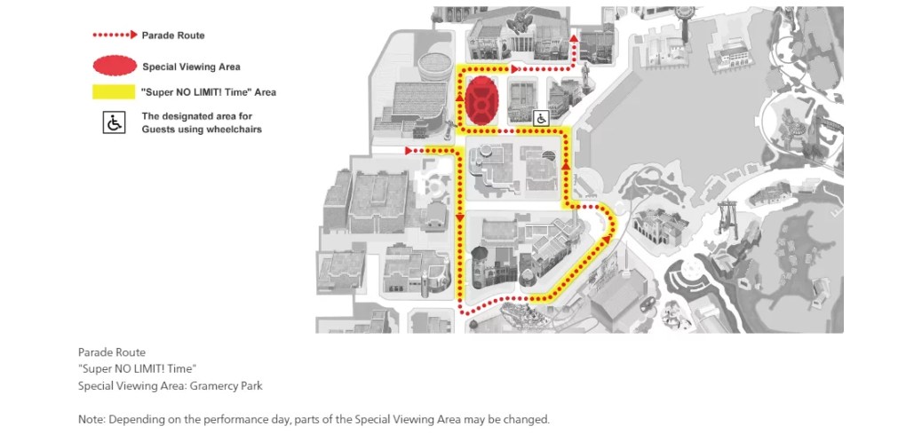 노란색 구역빨간 점선이 퍼레이드가 이동하는 루트이고 노란선은 Super no limt time이라고 하여 함께 참여하여 즐길 수 있는 부분입니다....