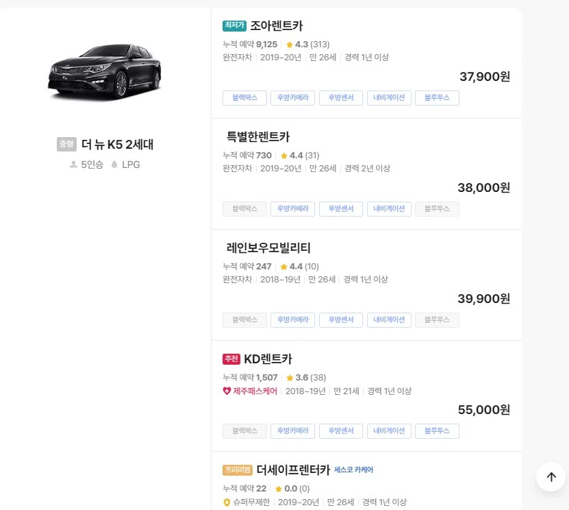 7. 저는 중형차를 선호하여 더뉴 K5 2세대 그리고 누적예약 수가 많고 평점이 괜찮은 조아렌트카를 선택했습니다.