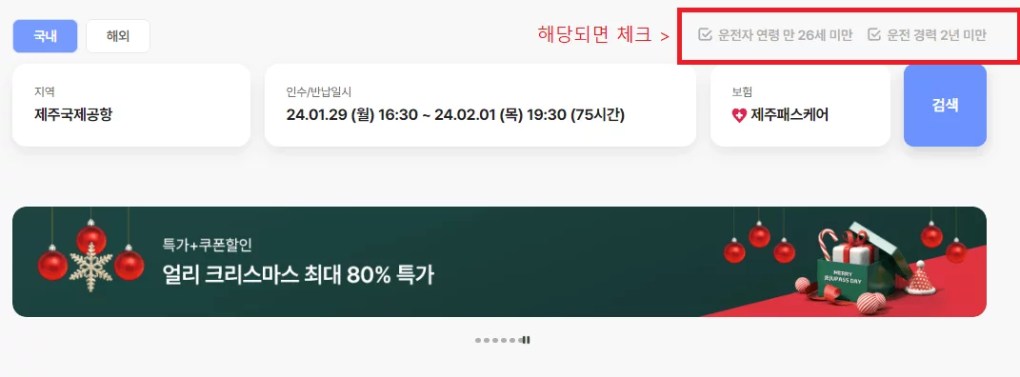 5. 운전자 연령 및, 운전경력사항을 보시고 해당되면 체크 하신 후 ‘검색’ 클릭합니다.