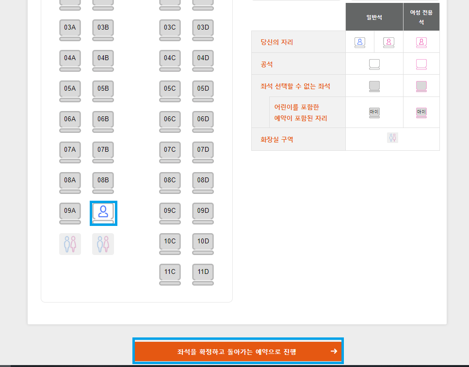 6. 남아 있는 좌석을 클릭 후 아래 주황색 버튼을 클릭합니다.