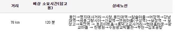기점은 용인이고, 종점은 김포공항입니다. 거리는 78km로 예상 소요시간은 2시간입니다. 위의 노선도에서 확인결과 부천은 김포공항가는 예매가 불가능합니다.